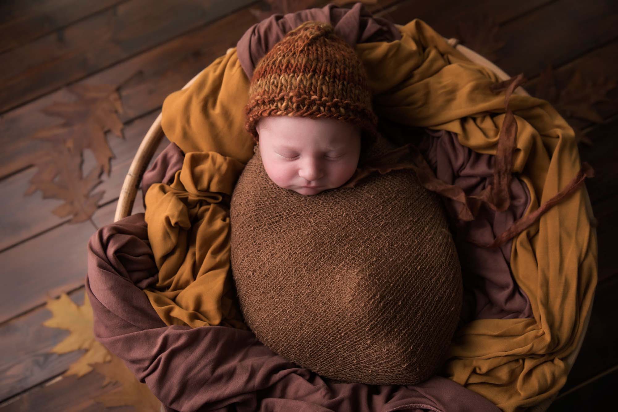 It’s so lovely when i can meet gorgeous babies after a maternity session. We were lucky to do his mum’s amazing maternity images this summer. We were so excited to meet this lovely couple again,this time with their little boy, Leon. I was so happy to be their newborn photographer! Little Leon came into the studio half asleep. We gave him an extra bottle that made him even sleepier. After wrapping him up,we could start the newborn session with some basket images. He stayed very sleepy during the session. In autumn i love using leaves and brownish colours. I knew it immediately these images would be stunning..